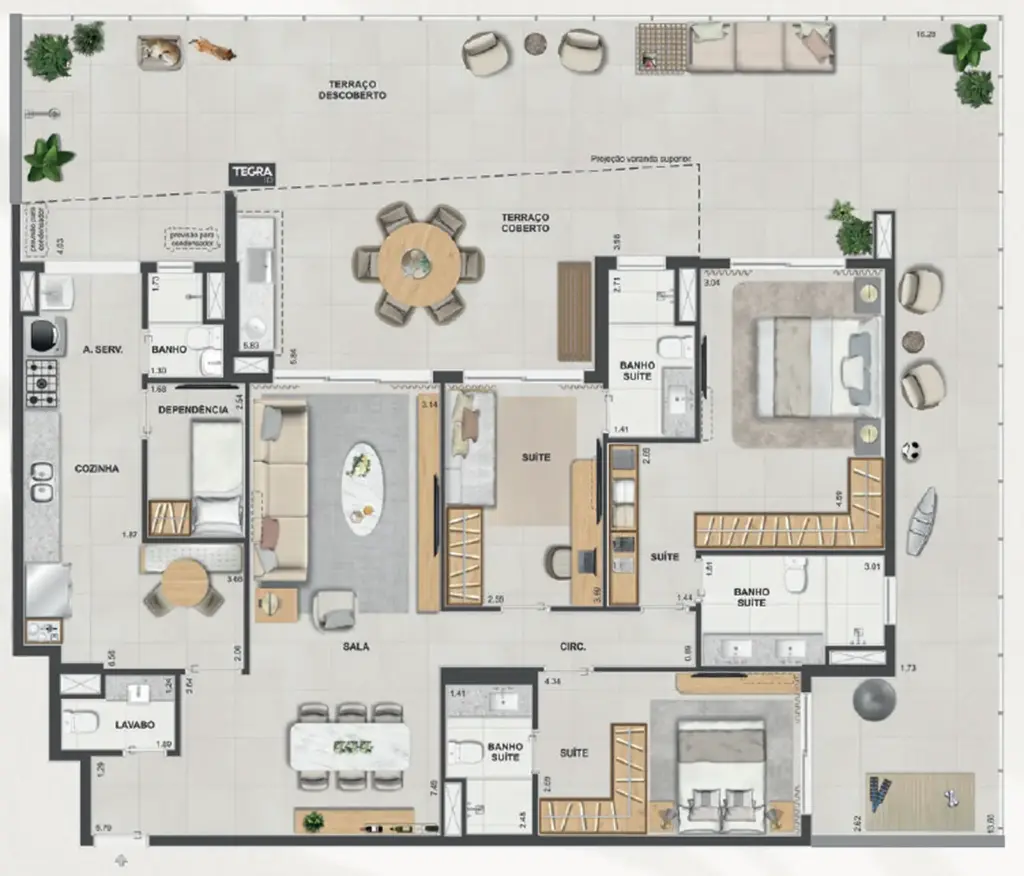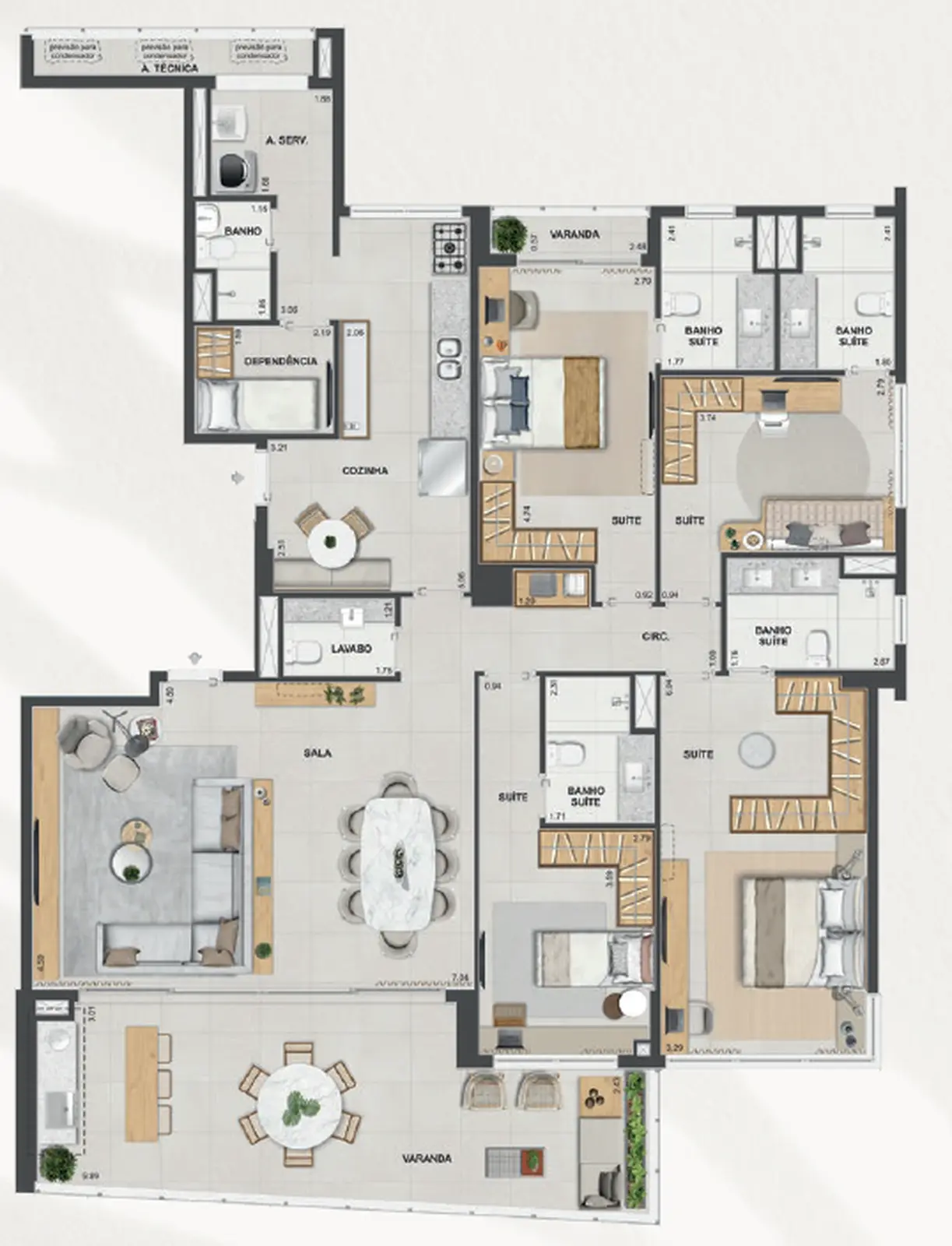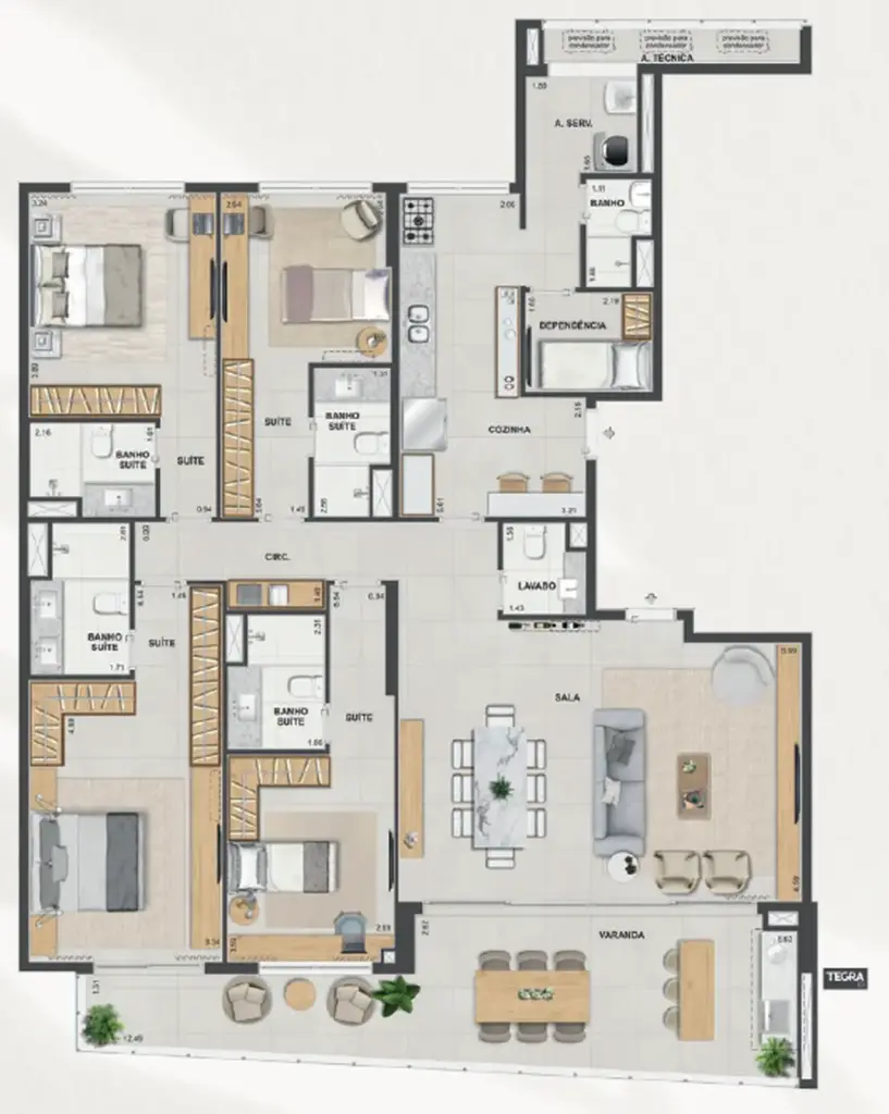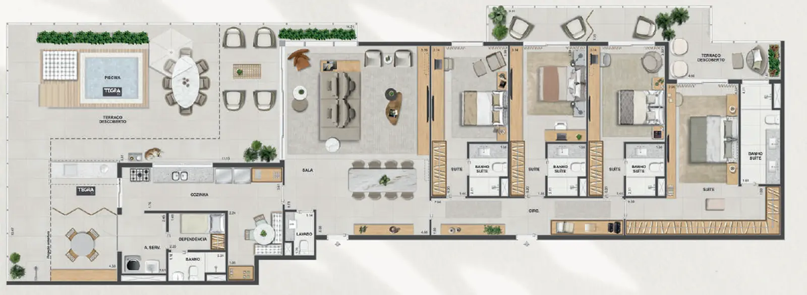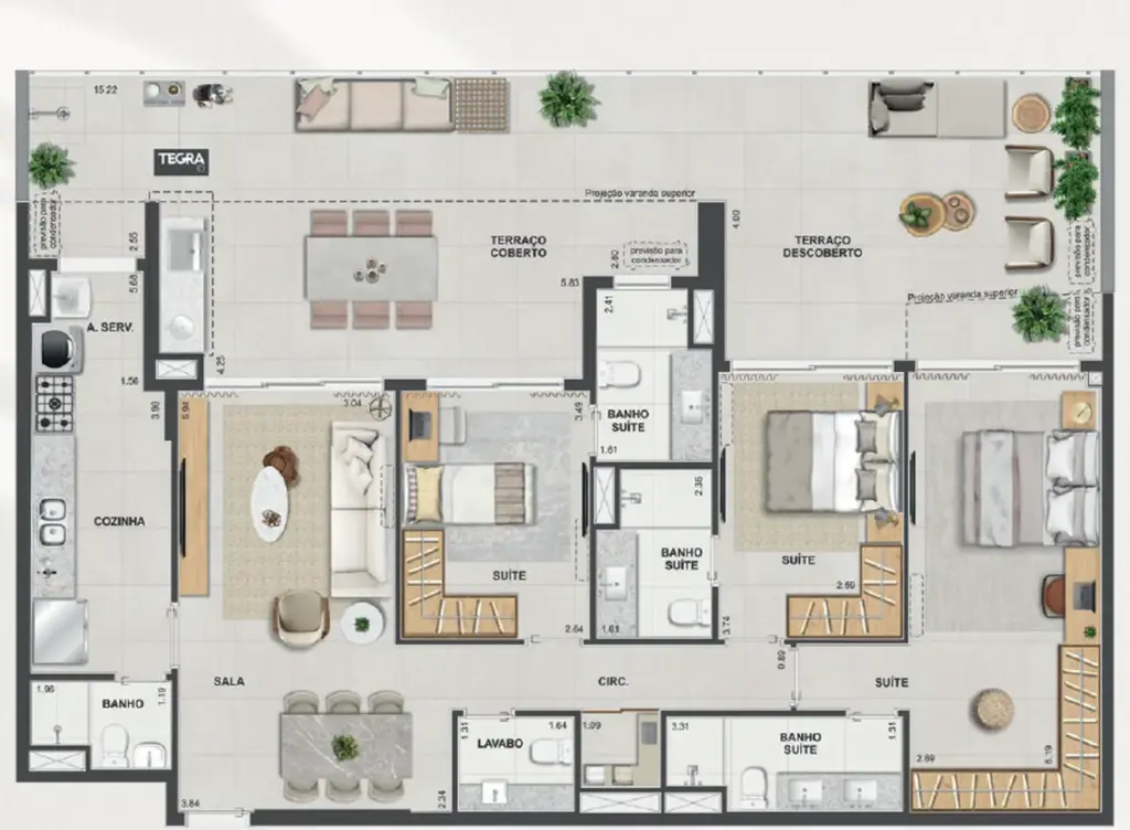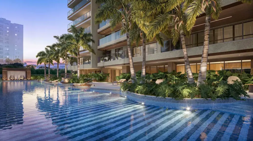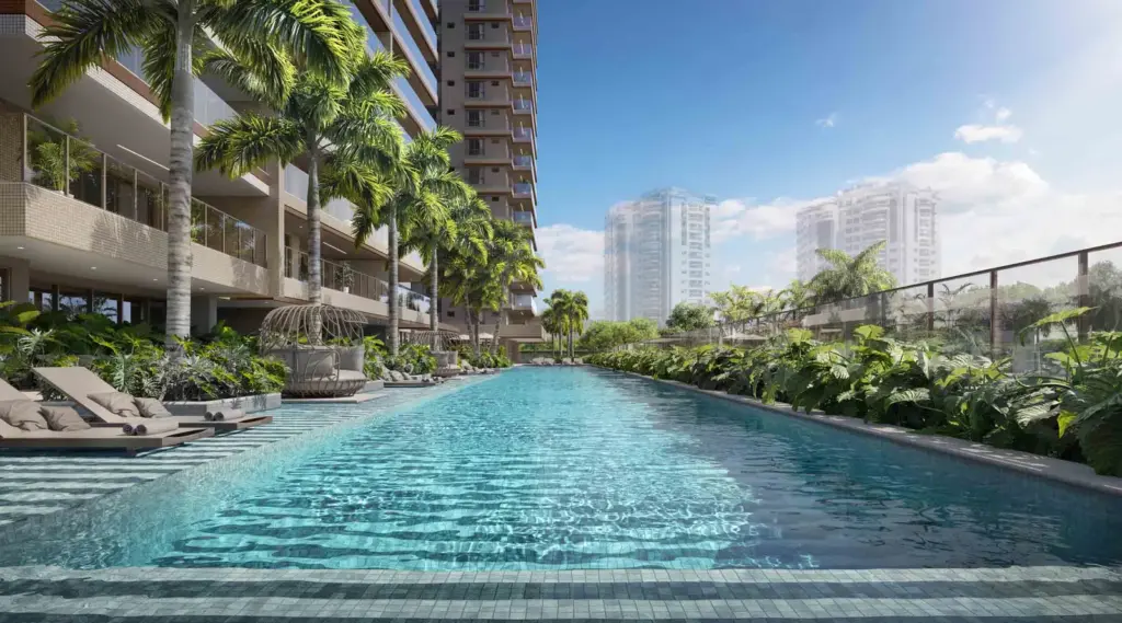 Em um dos pontos mais nobres da Barra da Tijuca, a Península, o Gran Thai Leisure Residence apresenta um conceito de residencial-resort que combina natureza, arquitetura contemporânea e serviços pensados para o cotidiano. O masterplan valoriza percursos ao ar livre, praças e jardins integrados aos espaços de convivência, enquanto as fachadas e varandas exploram a luz e a ventilação natural. Os apartamentos-tipo de 3 e 4 suítes (125 a 210 m²) privilegiam salas amplas e varandas generosas para cozinhar, receber e relaxar; os gardens ampliam a vida externa com terraços ajardinados; e as coberturas — lineares ou duplex estendem a experiência de morar com vistas abertas e ambientes para bem-estar. No clube interno, o lazer inclui piscina com raia e borda molhada, piscina infantil e solário; academia de alto padrão com área funcional; spa com salas de massagem e áreas de relaxamento; salão de festas e salões gourmet; brinquedoteca e espaço teen; além de coworking e salas de reunião que aproximam rotina e produtividade. Quadras e áreas multiúso favorecem prática esportiva, enquanto soluções como bicicletários, espaço delivery/lockers e infraestrutura para recarga de veículos trazem praticidade. Inserido entre parques, lago e shoppings de referência, com acesso fácil às principais vias da Barra, o Gran Thai une privacidade, paisagismo autoral e lazer completo — um refúgio urbano que traduz conforto, sofisticação e segurança em um endereço desejado.