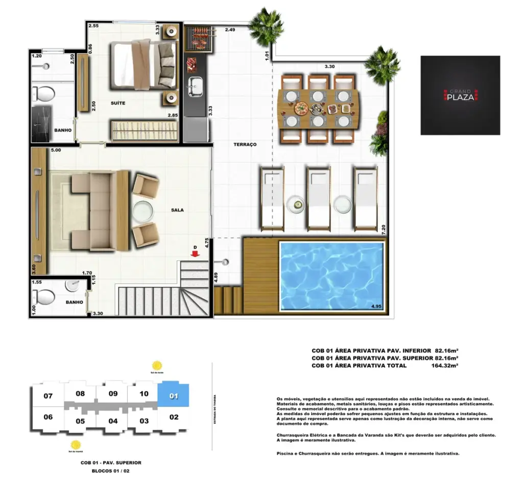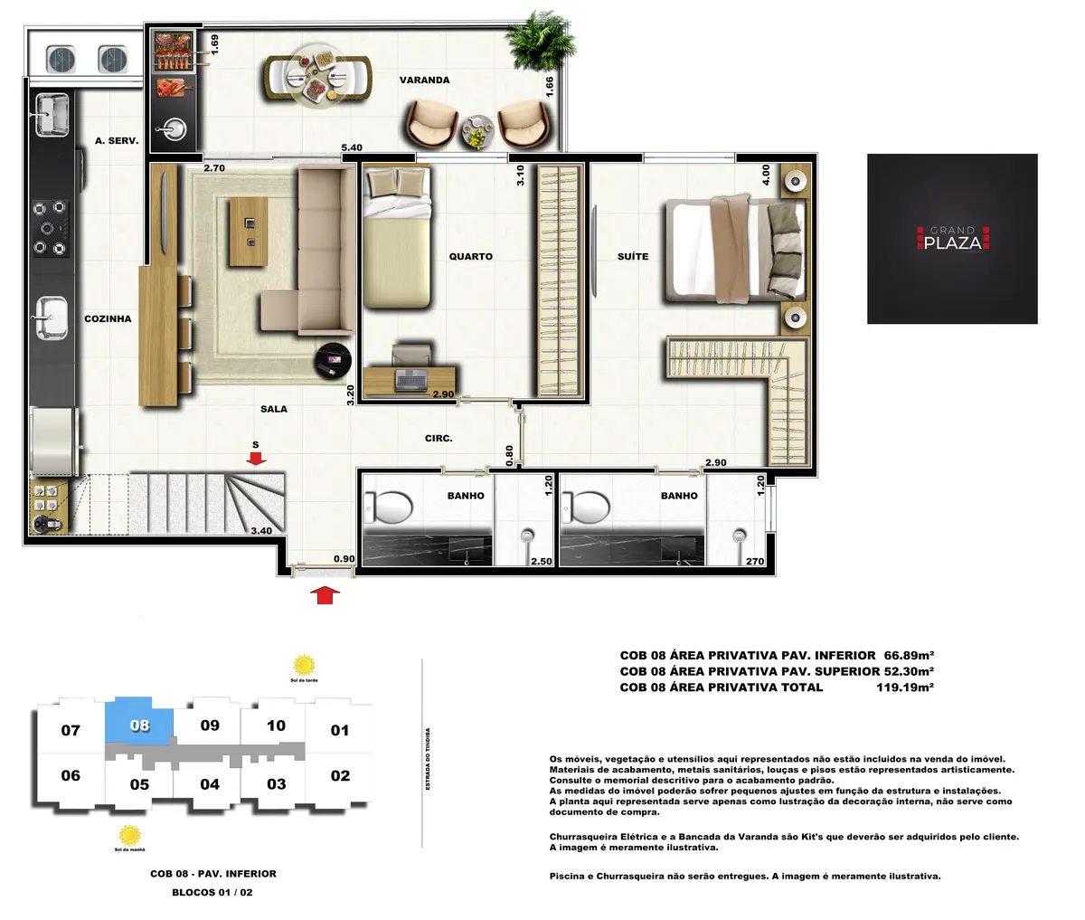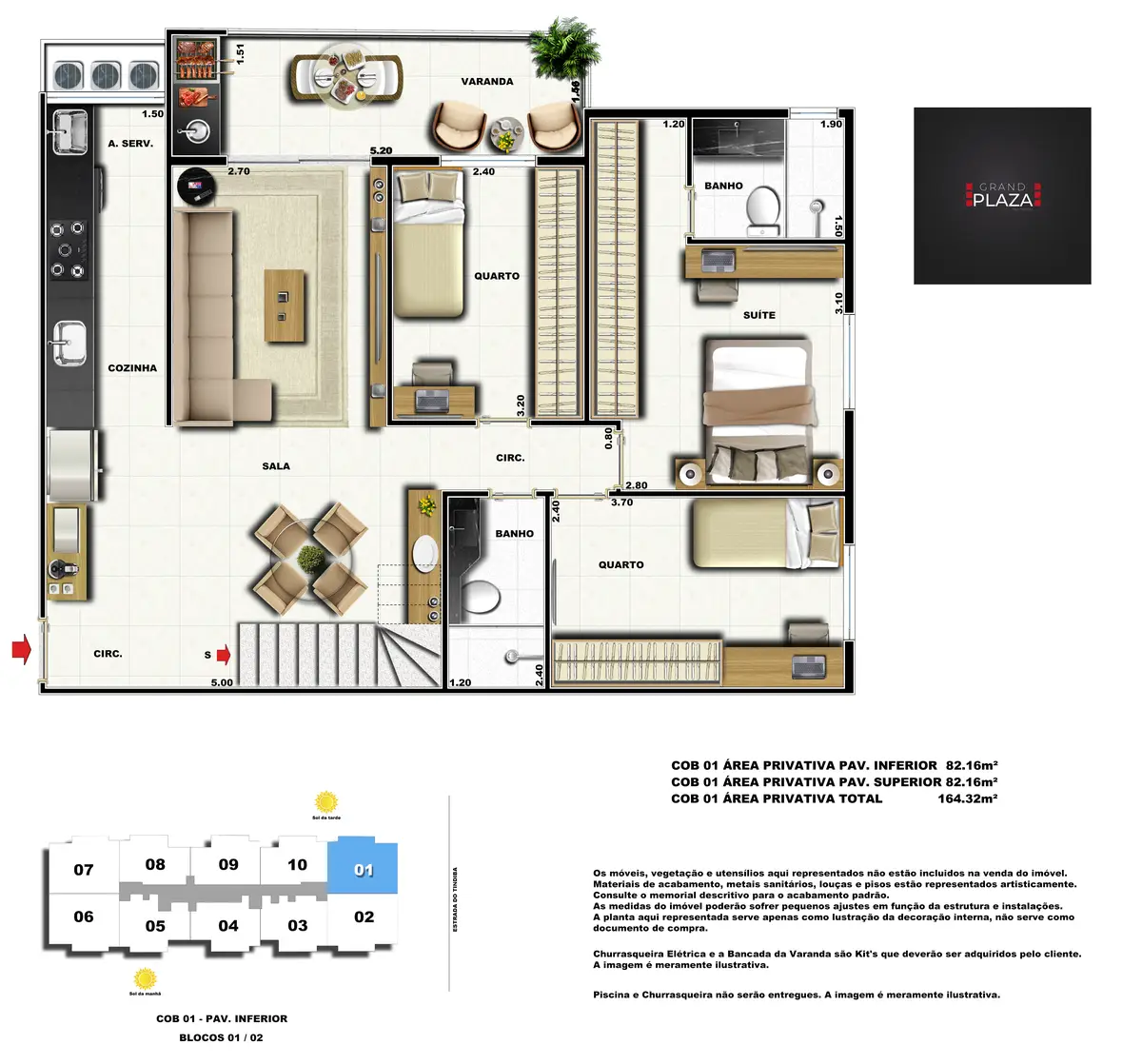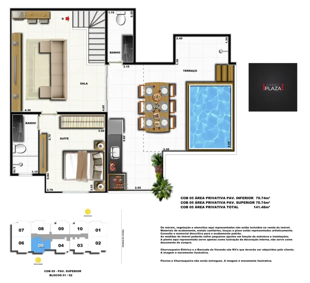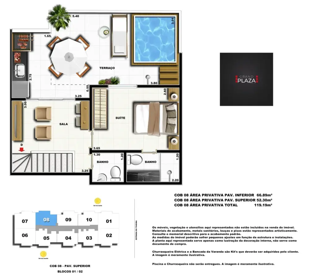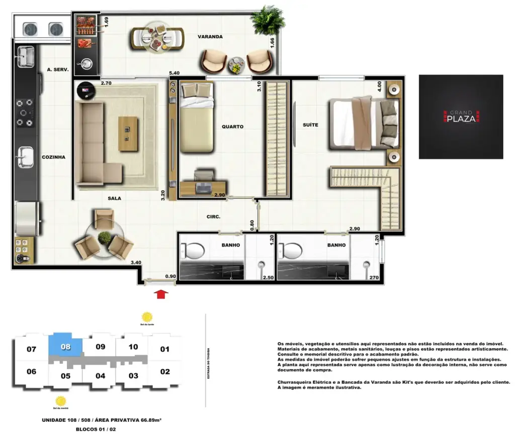 No coração da Taquara, o Grand Plaza Residences combina espaço, design e conveniência para uma vida completa em Jacarepaguá. Os apartamentos de 2 e 3 quartos (1 suíte) foram pensados para valorizar a luz natural, a integração da sala com a varanda e os acabamentos de qualidade, criando ambientes acolhedores para o dia a dia. Nas coberturas, a experiência se amplia com terraços perfeitos para receber e relaxar, com vistas abertas e privacidade. O condomínio oferece lazer para todas as idades: piscina convidativa, salão de festas elegante, churrasqueira ao ar livre, área fitness moderna, espaço kids lúdico, Game Zone para diversão, quadra de areia e bicicletário — além de praticidade com elevadores e organização inteligente das áreas comuns. Com endereço estratégico você fica perto de comércios, serviços, BRT e acessos da Transolímpica, garantindo mobilidade e facilidade diárias em um cenário urbano em evolução.