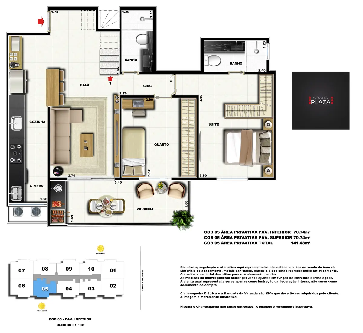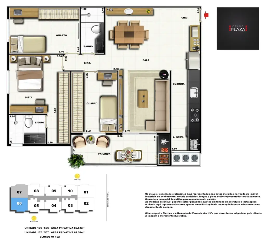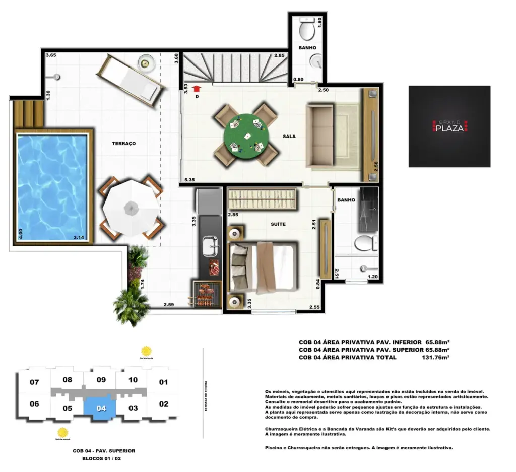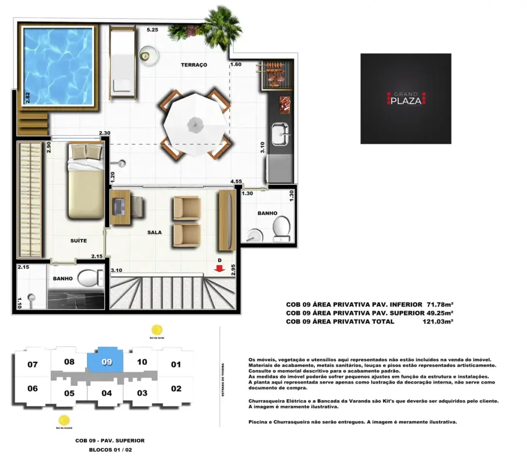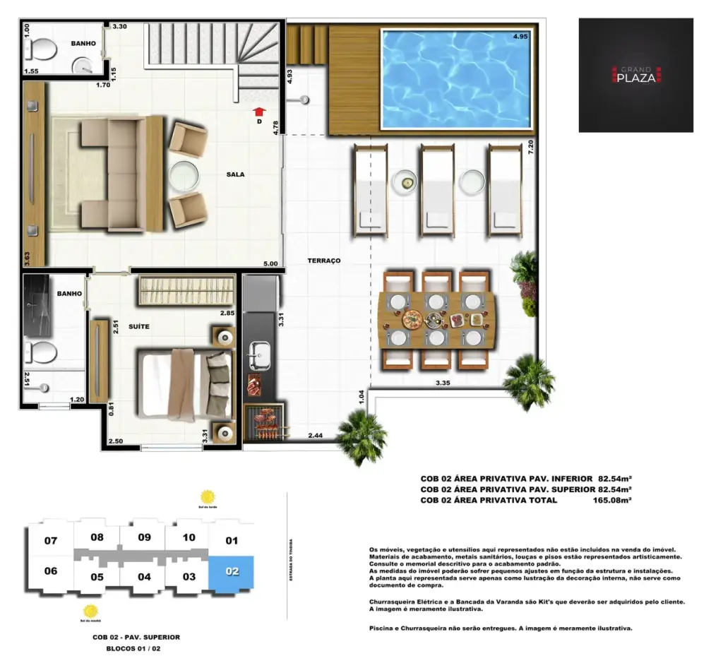 No coração da Taquara, o Grand Plaza Residences combina espaço, design e conveniência para uma vida completa em Jacarepaguá. Os apartamentos de 2 e 3 quartos (1 suíte) foram pensados para valorizar a luz natural, a integração da sala com a varanda e os acabamentos de qualidade, criando ambientes acolhedores para o dia a dia. Nas coberturas, a experiência se amplia com terraços perfeitos para receber e relaxar, com vistas abertas e privacidade. O condomínio oferece lazer para todas as idades: piscina convidativa, salão de festas elegante, churrasqueira ao ar livre, área fitness moderna, espaço kids lúdico, Game Zone para diversão, quadra de areia e bicicletário — além de praticidade com elevadores e organização inteligente das áreas comuns. Com endereço estratégico você fica perto de comércios, serviços, BRT e acessos da Transolímpica, garantindo mobilidade e facilidade diárias em um cenário urbano em evolução.
