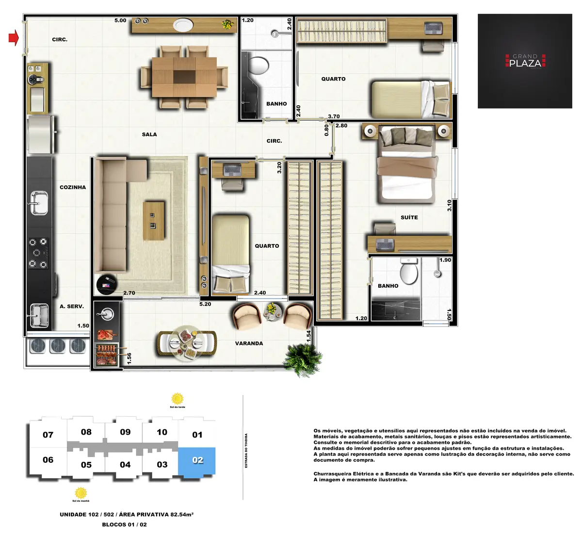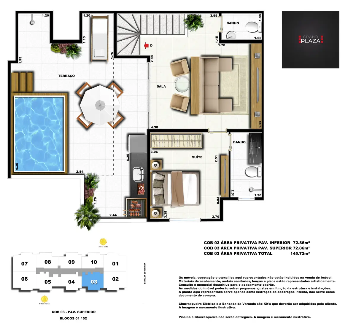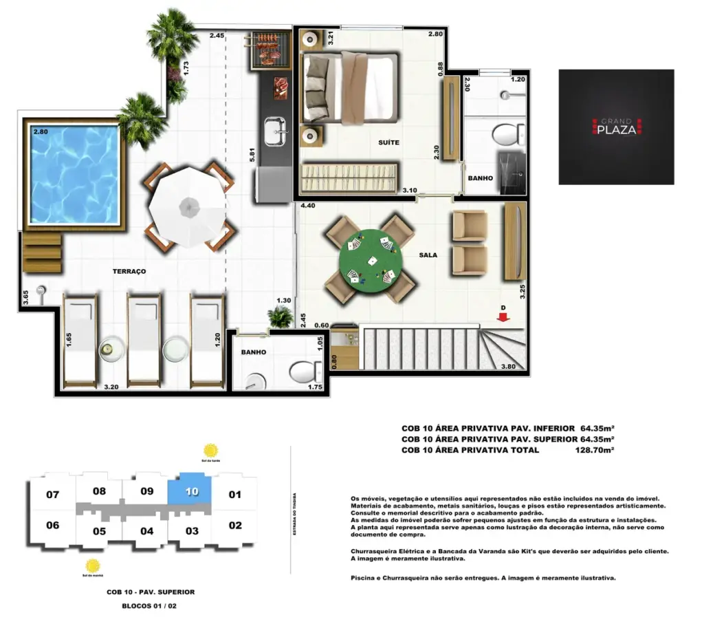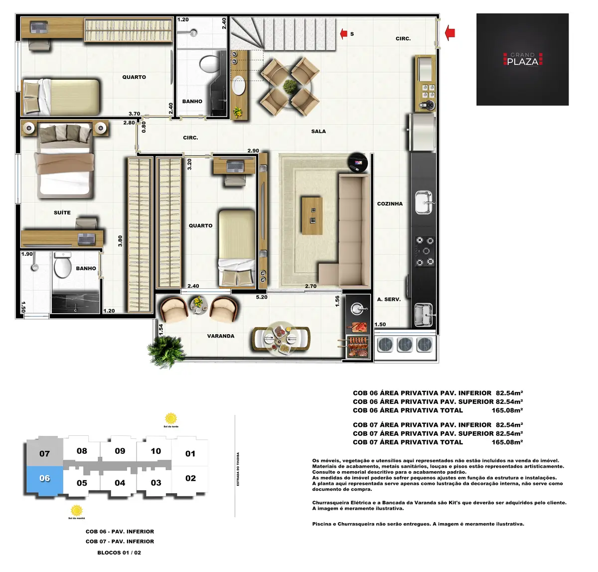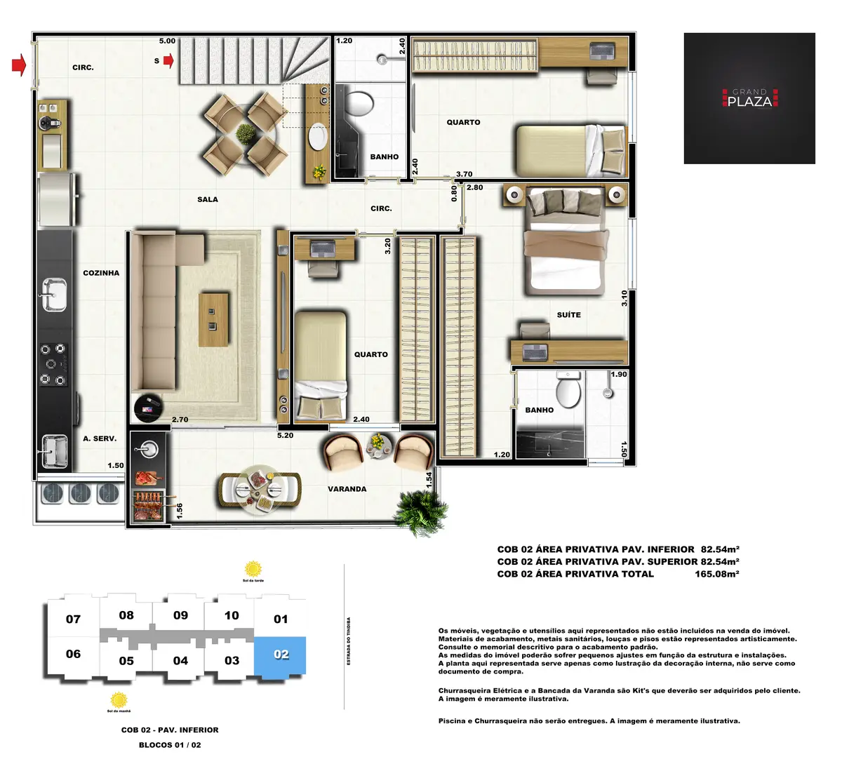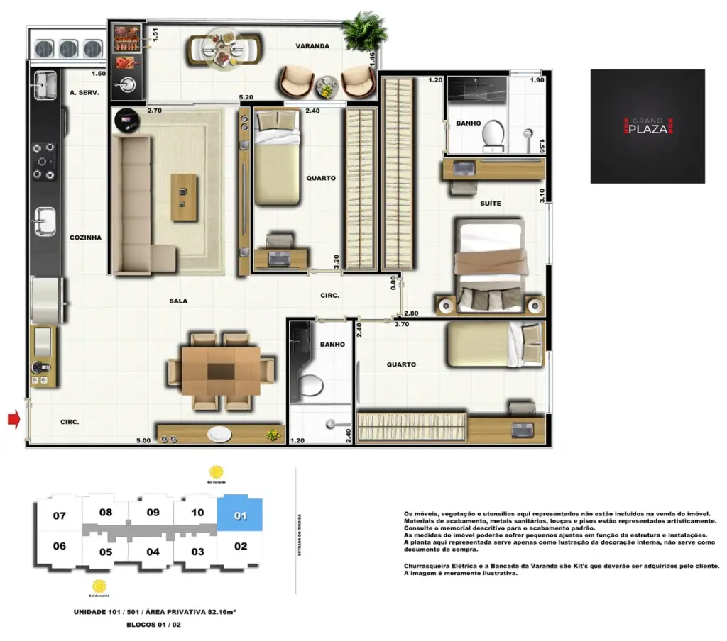 No coração da Taquara, o Grand Plaza Residences combina espaço, design e conveniência para uma vida completa em Jacarepaguá. Os apartamentos de 2 e 3 quartos (1 suíte) foram pensados para valorizar a luz natural, a integração da sala com a varanda e os acabamentos de qualidade, criando ambientes acolhedores para o dia a dia. Nas coberturas, a experiência se amplia com terraços perfeitos para receber e relaxar, com vistas abertas e privacidade. O condomínio oferece lazer para todas as idades: piscina convidativa, salão de festas elegante, churrasqueira ao ar livre, área fitness moderna, espaço kids lúdico, Game Zone para diversão, quadra de areia e bicicletário — além de praticidade com elevadores e organização inteligente das áreas comuns. Com endereço estratégico você fica perto de comércios, serviços, BRT e acessos da Transolímpica, garantindo mobilidade e facilidade diárias em um cenário urbano em evolução.