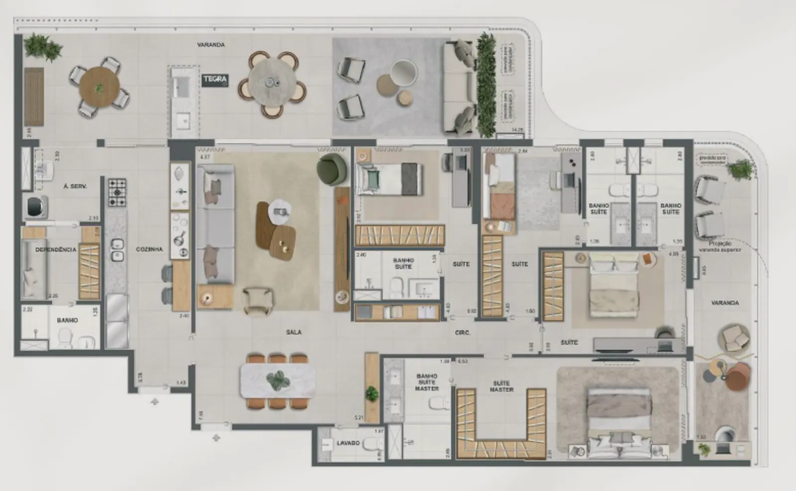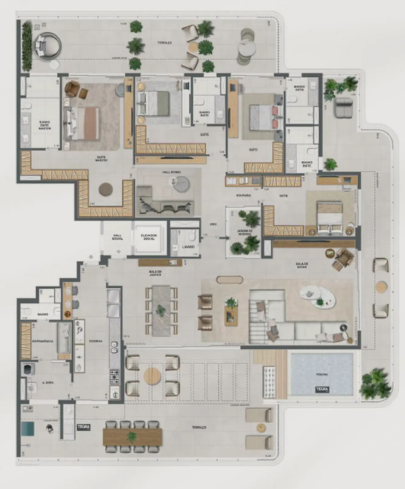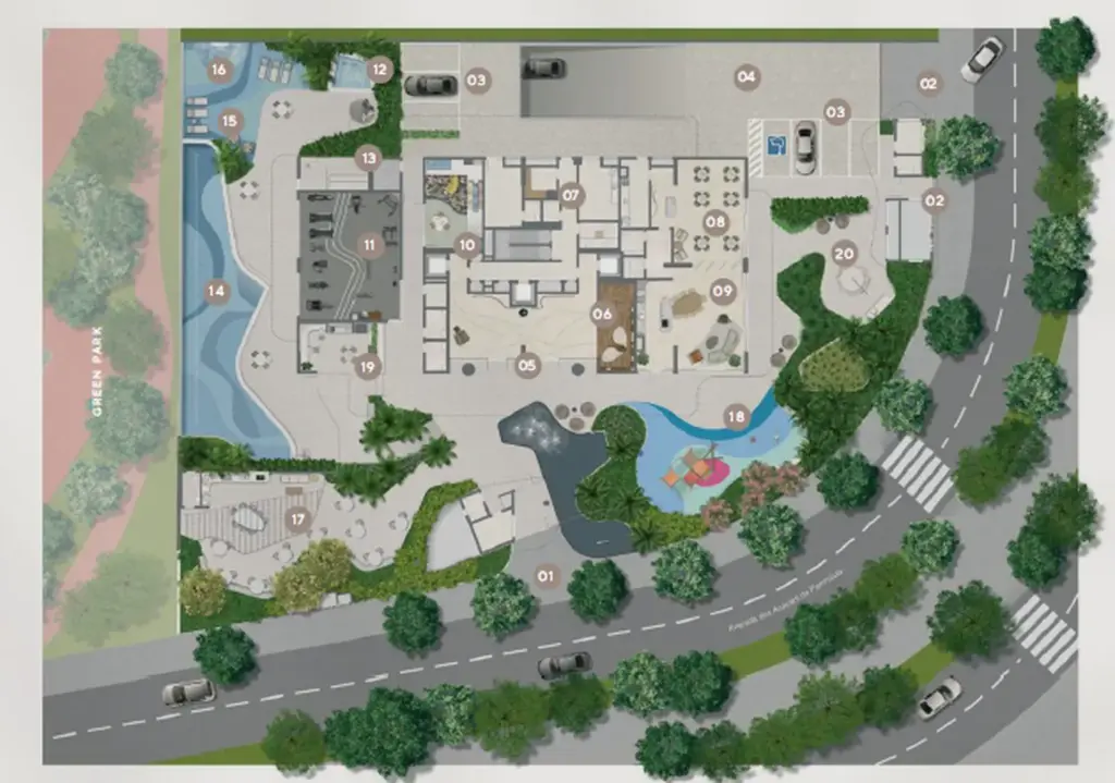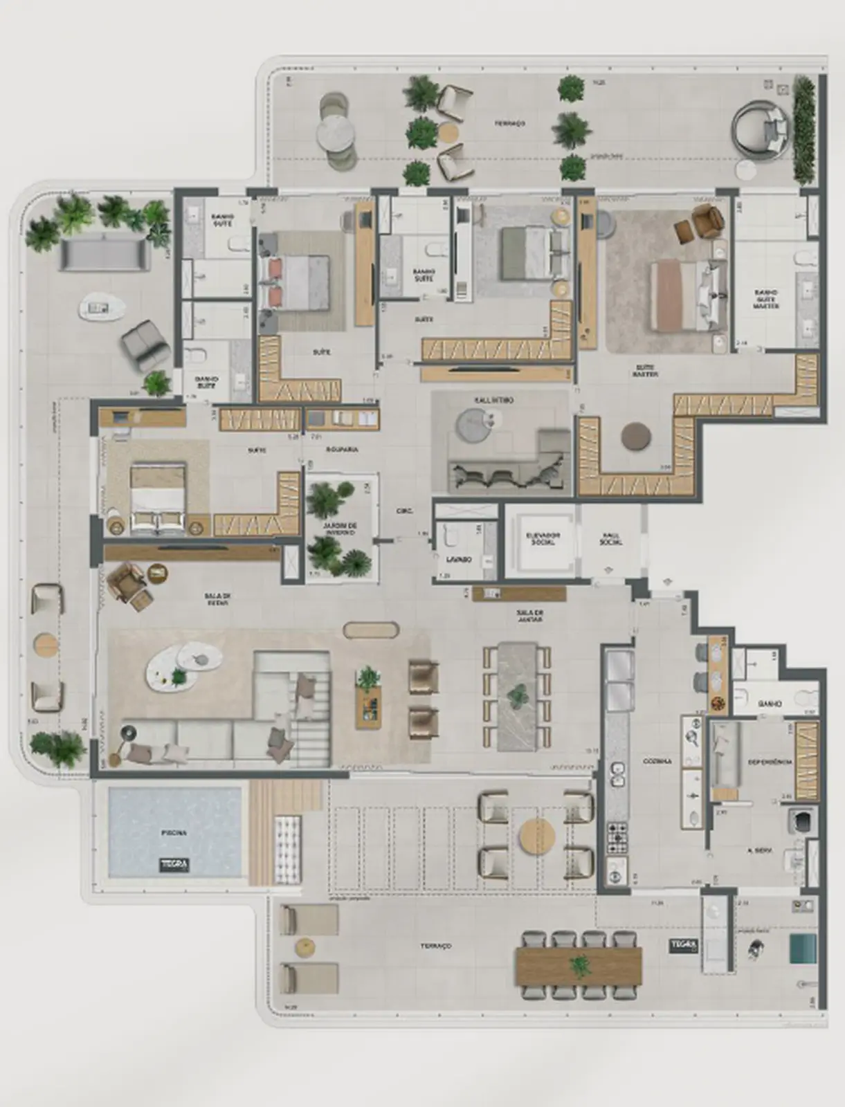 Na Península, um dos cenários mais verdes e planejados da Barra da Tijuca, o Singular Private Residence nasce para reunir sofisticação, bem-estar e exclusividade em uma torre única. A implantação privilegia eixos de paisagismo, percursos ao ar livre e vistas abertas para o Green Park, enquanto fachadas e varandas exploram luz natural e ventilação cruzada. Os apartamentos de 4 suítes (221–229 m²) integram sala e varanda em ambientes generosos para receber, cozinhar e relaxar; já as coberturas lineares (452 m²) ampliam a vida ao ar livre com espaços ideais para refeições, banho de sol e contemplação. O lazer foi pensado como extensão da casa: piscina de 25 m voltada para o parque, piscina infantil, solário, academia de alto padrão (equipamentos Technogym) e spa/sauna para desacelerar. A convivência acontece em salão de festas e espaços gourmet, além de lounges e áreas multiúso; a produtividade encontra lugar em coworking e salas de reunião. Para famílias, há brinquedoteca, espaço teen e áreas abertas para brincar; para os pets, estrutura dedicada de pet care. O cotidiano ganha praticidade com bicicletários, lockers e espaço delivery, além de infraestrutura para recarga veicular. Cercado por shoppings de referência, parques e o lago da Península — com fácil acesso às principais vias da Barra — o Singular combina paisagismo autoral, tecnologia e segurança em um residencial-resort raro, feito para poucos. (Dados oficiais de tipologias/áreas no site da Tegra; itens de lazer conforme página do empreendimento.)